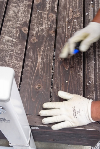 サッシ際、板と板の間は、先に刷毛で塗料を塗っていきます。