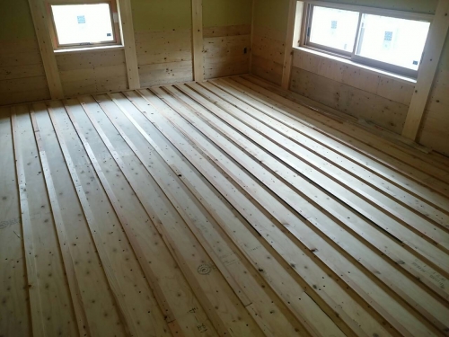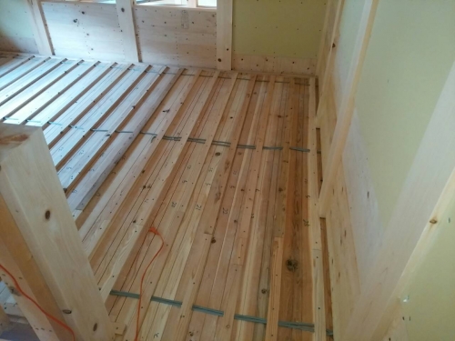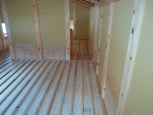 その特徴をより効果的に活かせるようにするために、下地となる合板の上に直接仕上材を張らずに、根太を施工する事により、下地材と仕上材の間に空気層を設置しております。