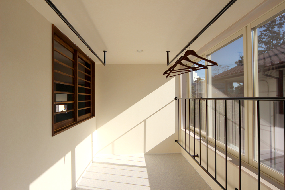 2階には「夜お洗濯をする」というライフスタイルと「雨の日でも気にせず干せる室内干しが欲しい」というご要望に合わせ、敢えてバルコニーは設けずランドリー室を設置。南面に配置し自然光がたっぷり注ぐよう計画しました。窓際には、転落防止・手摺・布団干しの多機能を完備した特注のステンレスパイプを設置。もちろん、天井にも、きちんと壁からの位置、パイプ間の空間を計算し、洗濯干用のパイプを設置。インテリアとしてもアクセントになっています。