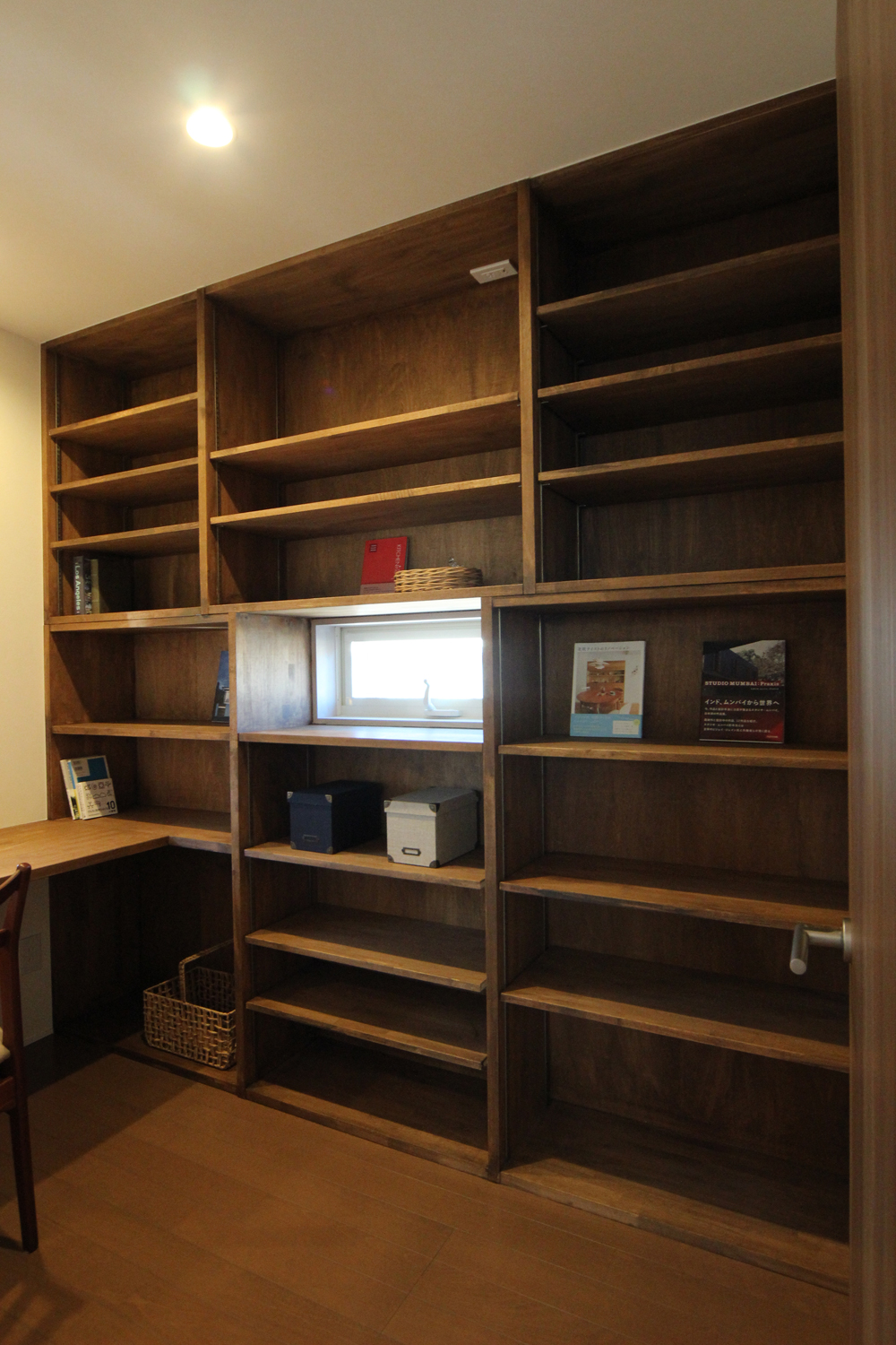 お仕事柄、たくさんの書籍、資料の保管が必要になるとのことで、壁面一面に造作の本棚を設置。お仕事に集中出来るようにこの本棚の中に、エアコンを設置するスペースも最初から確保!これで、どんどんお仕事がはかどりますね!!