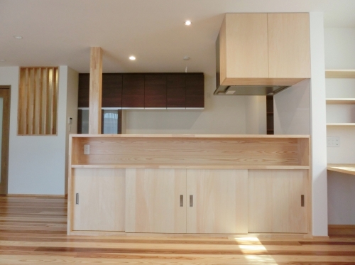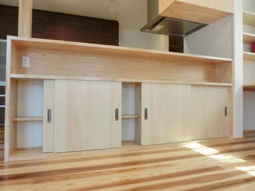 収納棚の扉を、開き戸にしてしまうと、ダイニングテーブルの邪魔になってしまったり、遊んでいるお子さまに当ってしまったり・・・という事で、敢えて引き違いの建具に。