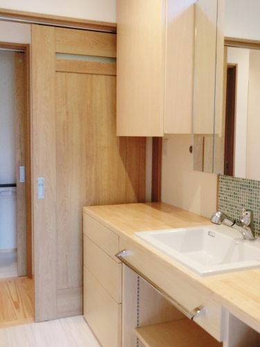 造作の化粧台には、実はかなりのこだわりが・・・(笑)。一番浴室側の台の下の扉の内側には、ランドリーボックスを置いておく予定。でも、いちいち扉を開けて洗濯物を投げ込むのは、ちょっとメンドクサイ・・・。そこでっ!空いている部分から洗濯物を投げ込んで、内部のカゴに入れる!という仕組み(笑)